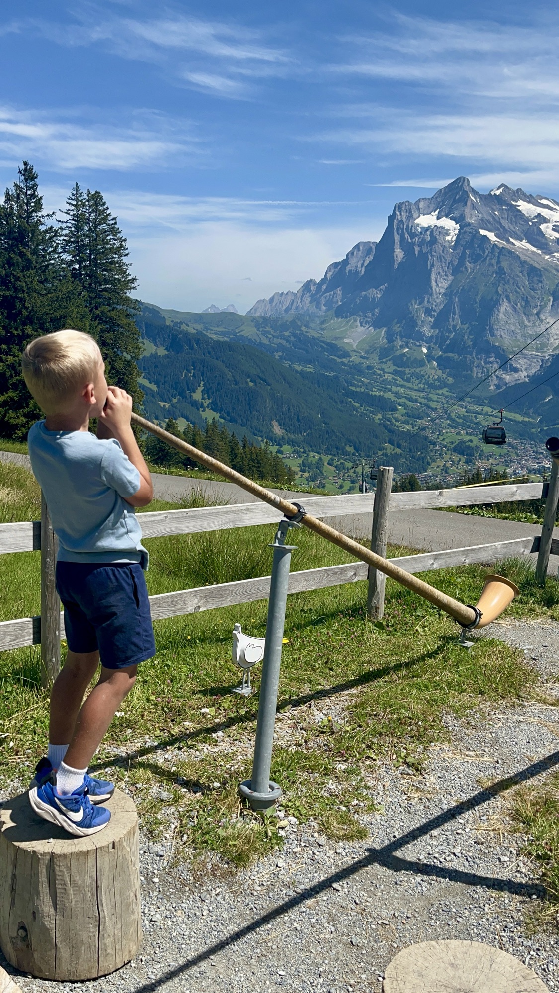 One of the top kid-friendly hikes in the Lauterbrunnen Valley is the Lieselotte Trail, which starts at Mannlichen and takes you halfway down the mountainside towards Grindelwald. Accessible by gondola from either Wengen or Grindelwald, this trail is themed around Lieselotte, a cow on vacation in the Swiss Alps. The hike includes 13 fun activity stations for kids (and adults!) to complete as they walk down the trail. Activities include ringing a cow bell, searching for marmots with binoculars, and playing an alphorn.