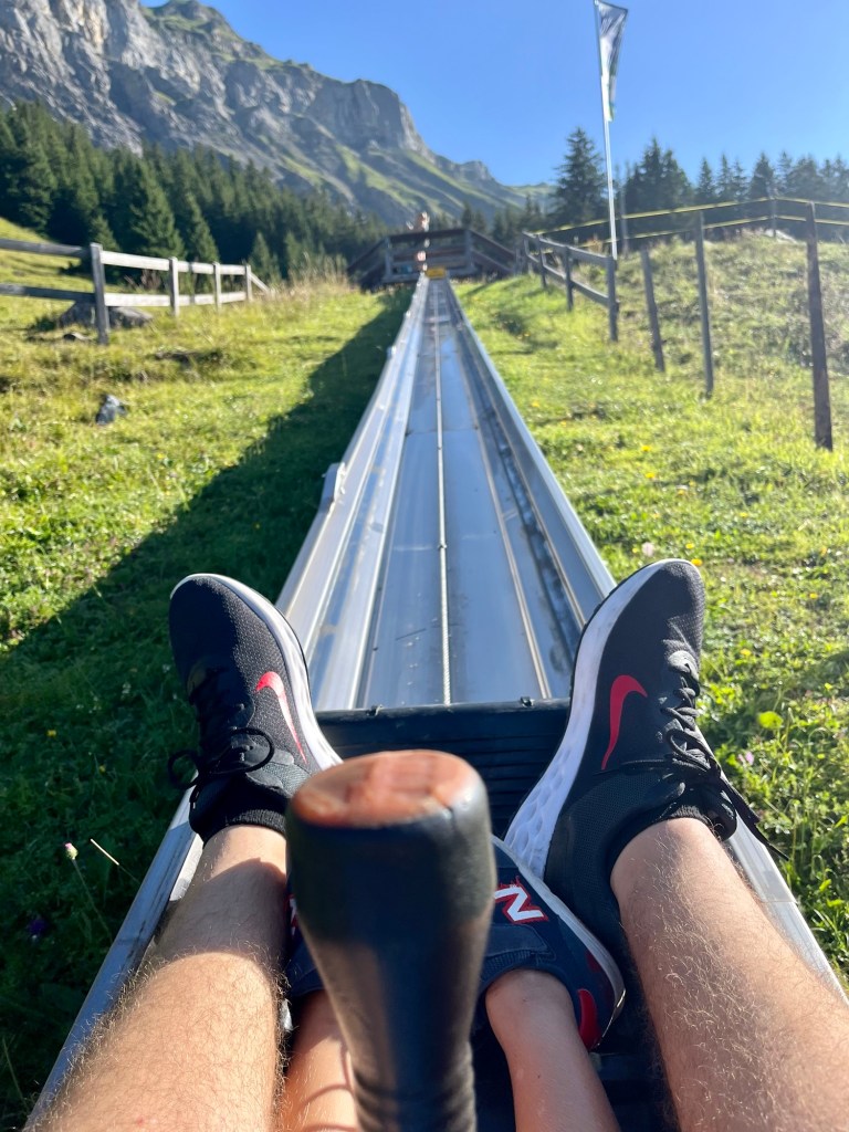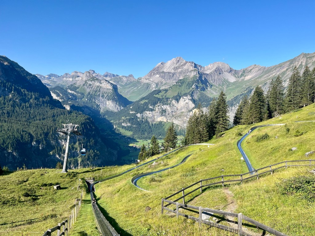 - Rodelbahn (mountain coaster): Located at the Oeschinen Station, you take a thrilling ride on a toboggan (mountain cart) down the mountainside. Kids have to be ages 3 and up to go on the ride and ages 8 and above can ride by themselves. You can buy tickets at a kiosk on-site and kids under 8 are free as you pay per cart/ride not per person.