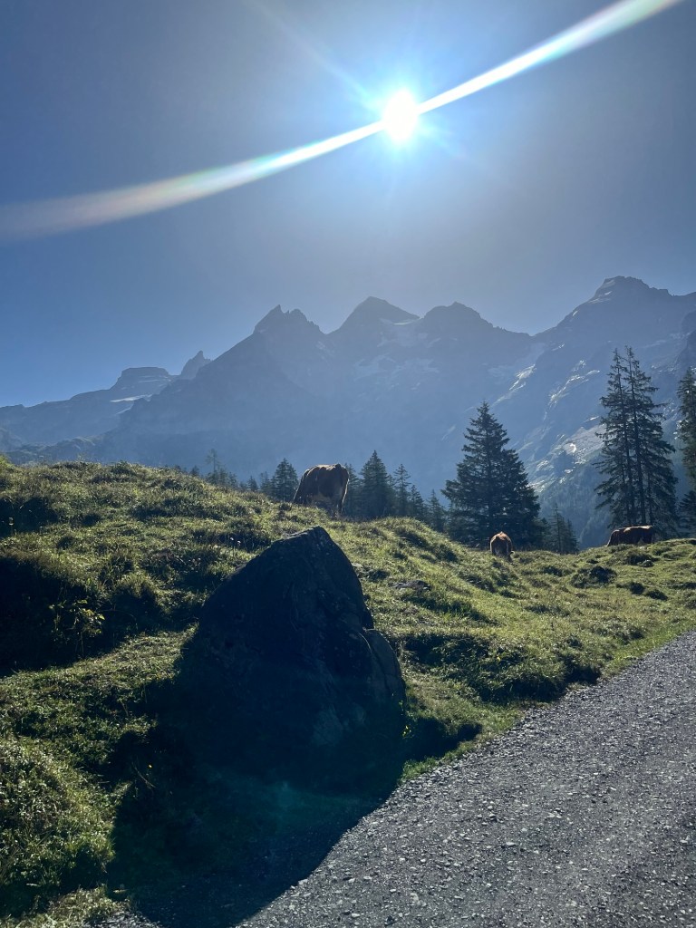 Once at the Oeschinen Station, we continued our hike to Oeschinensee itself. The trail is paved and gently slopes downhill, making it a perfect family hike. This 30-minute walk passes through scenic pastures with grazing cows, offering spectacular views of the Swiss Alps as you descend toward the lake.
