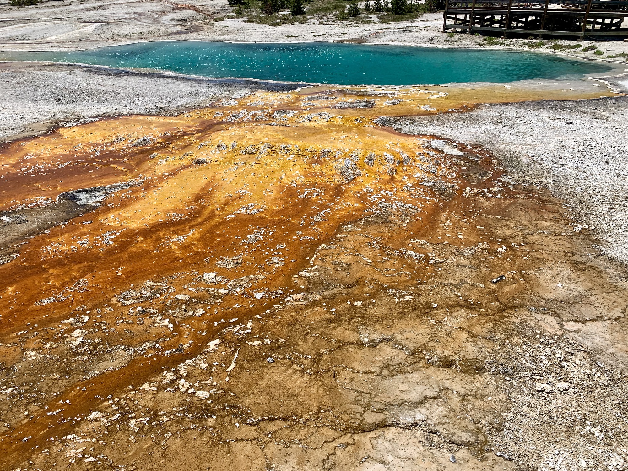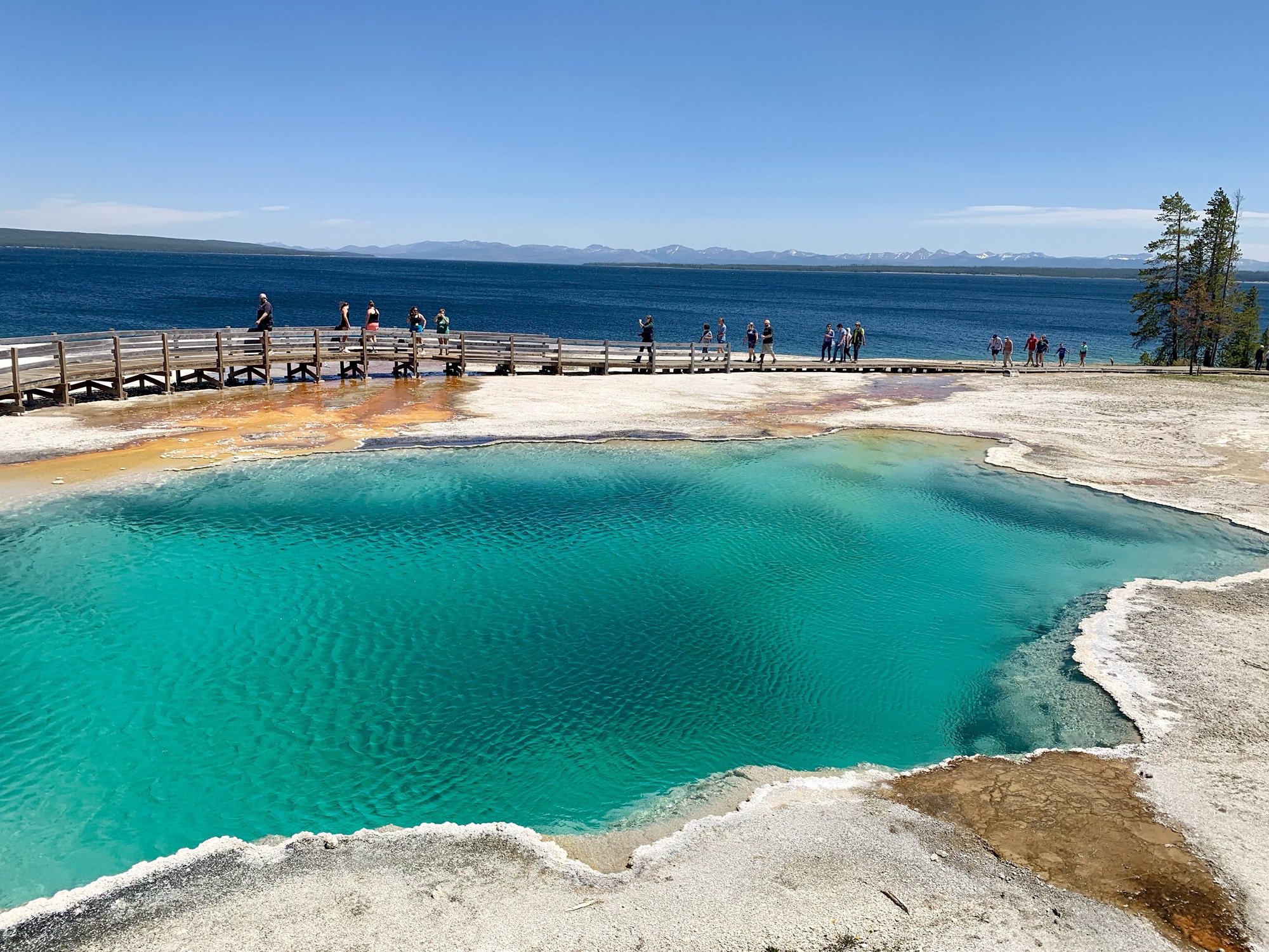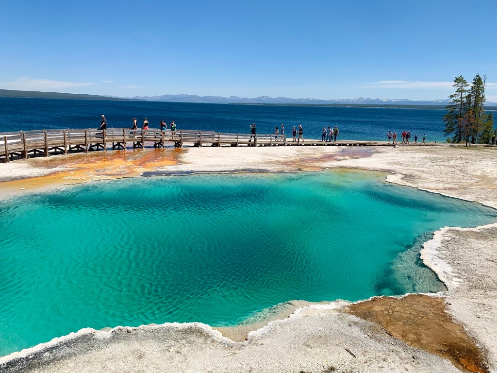 On the western side of the lake is an area called West Thumb which has really nice walking paths to see some incredible geysers and pools. The backdrop of the lake just beyond the trails make visiting this area even more picturesque.